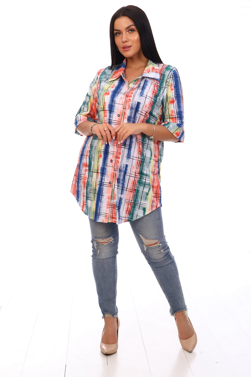 Туника на пуговицах. Приталенный силуэт дополняет округлым подолом и боковыми карманами. Рукав 3/4 и отложной воротник являются неотъемлемыми элементами офисного стиля.