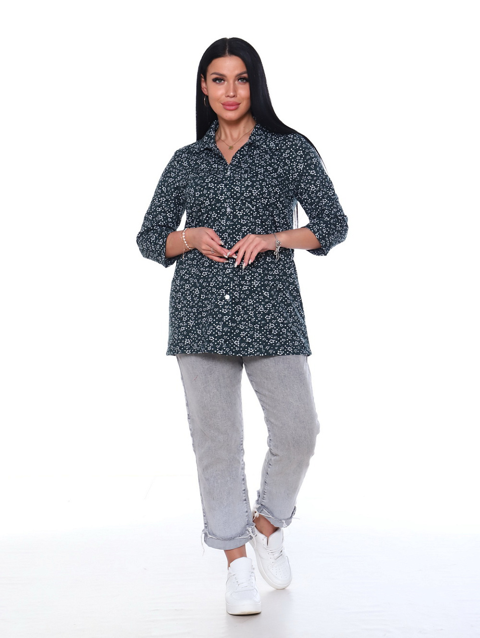 Туника на пуговицах приталенного силуэта с нагрудным карманом. Рукав 3/4 и отложной воротник.