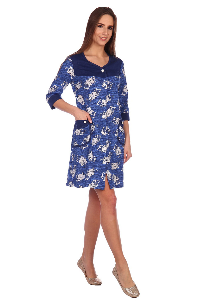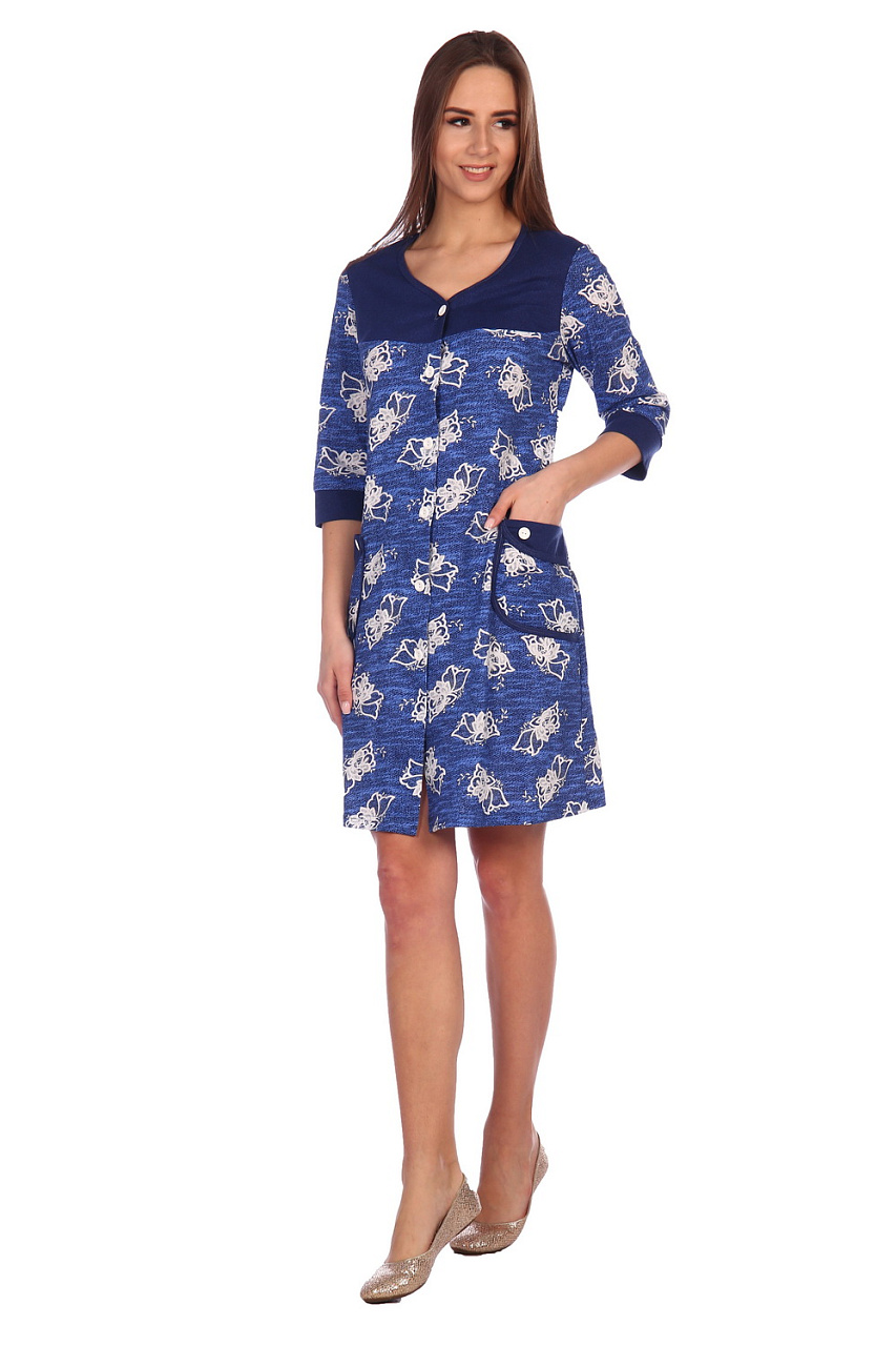 Халат на пуговицах . Рукав 3/4. Накладные карманы. Манжеты, обтачка карманов и кокетки контрастного цвета . Горловина обработана кантом. Вырез в виде сердечка.